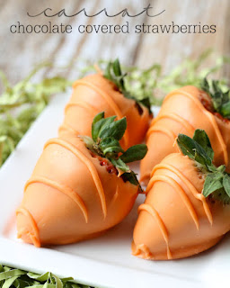 Super simple and super cute! Just get some orange {colored not flavored} chocolate melts. Melt chocolate. Dip strawberries & cool. Pipe {using a ziploc bag} some lines. Voila! I made these last year for our Easter party and I also brought some doughnut holes covered in powdered sugar {carrots & bunny tails!}.